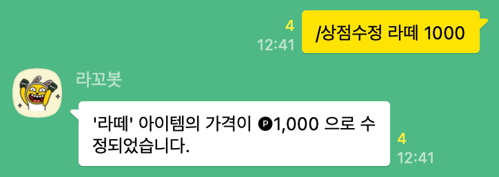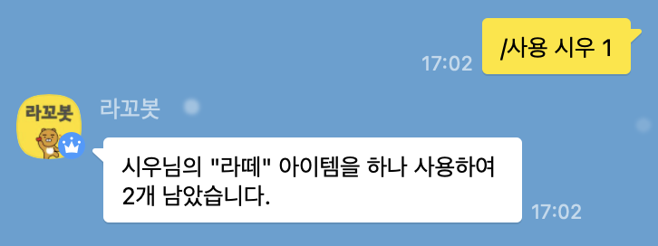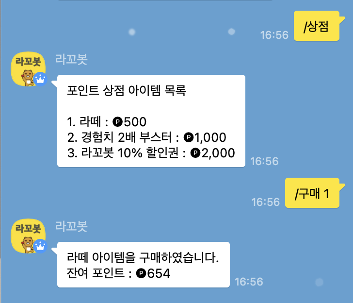 /구매 : 상점에 등록된 아이템 중 하나를 구매합니다. 명령어 뒤에 오는 숫자는 “/상점” 에서 확인
