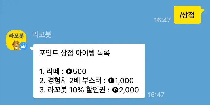 /상점 : 포인트로 구매할 수 있는 아이템 리스트를 표시